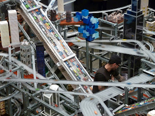 As Burden posited in his brief preliminary remarks, city traffic in the future may well all be remote-controlled, fast and driverless, as commuters head each in their separate vehicles to their destinations. The artist's vision, here, is a mind-bendingly intricate system of roller-coaster tracks, where closely serried, undulating lines of tiny, colorful Tinker Toy cars are hoisted up long, steep ramps...